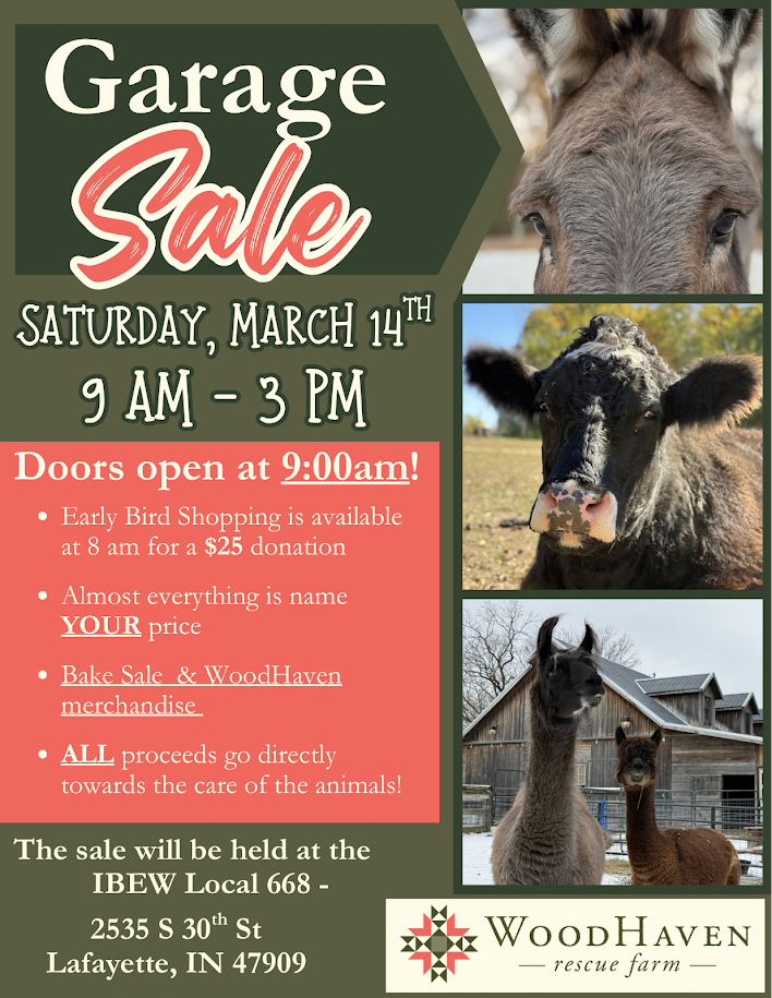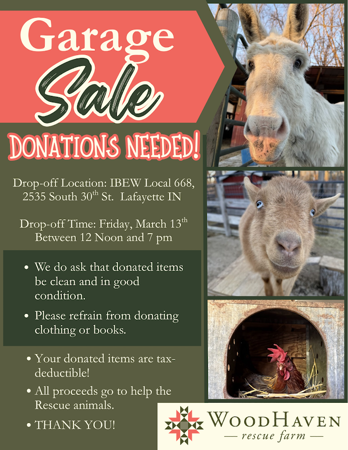 Upcoming Events 2026 Fundraising Events Garage Sale 9 am - 3 pmMarch 14th at the IBEW 668 Local2535 S 30th St. Lafayette, IN 47909Accepting drop-off donations on March 13th, from 12 pm - 7 pm 2026 Open House at the FarmSaturday, October 3rd 11 am - 4 pm